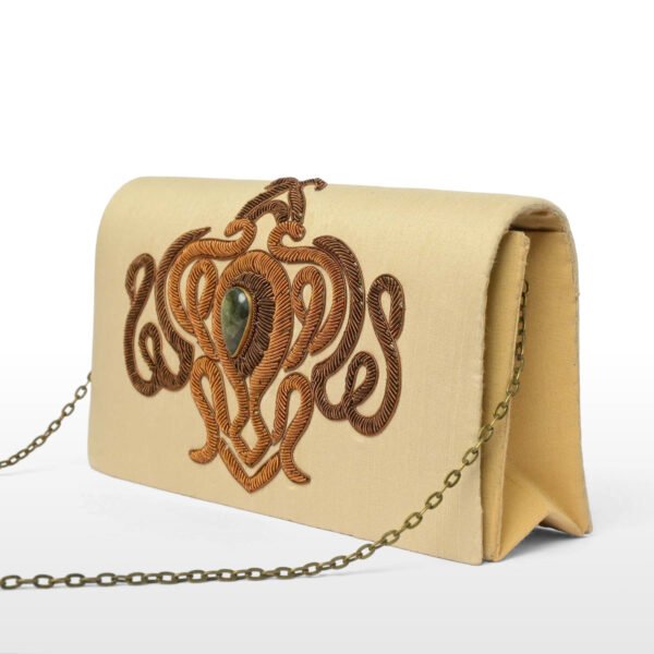 The unique design of this book bag further adds to its charm. Handcrafted with precision and care, it features a blend of traditional elegance and contemporary aesthetics. The LABRADORITE gemstone is strategically placed to complement the bag’s design, enhancing its overall appeal.