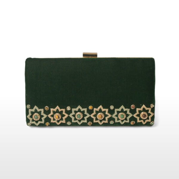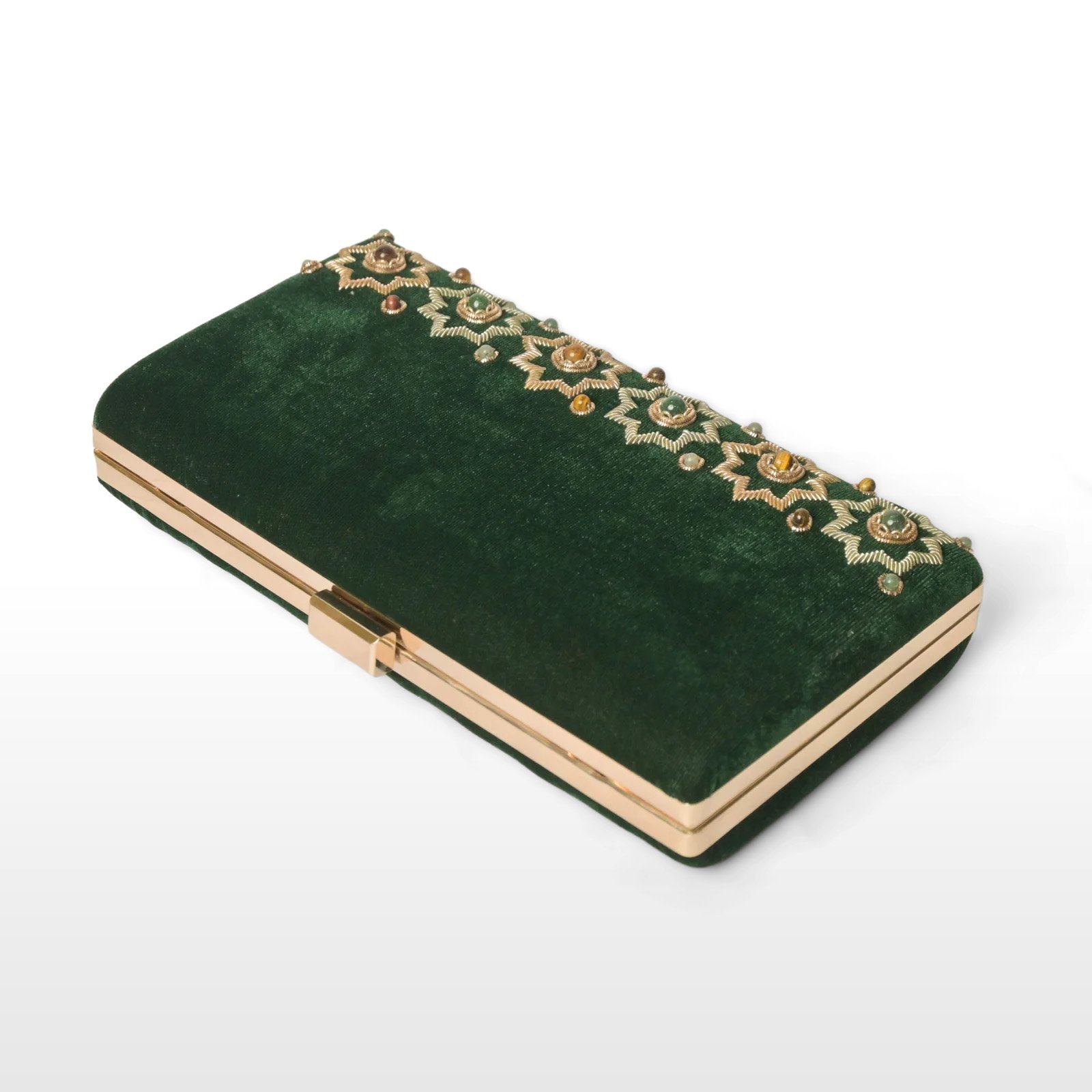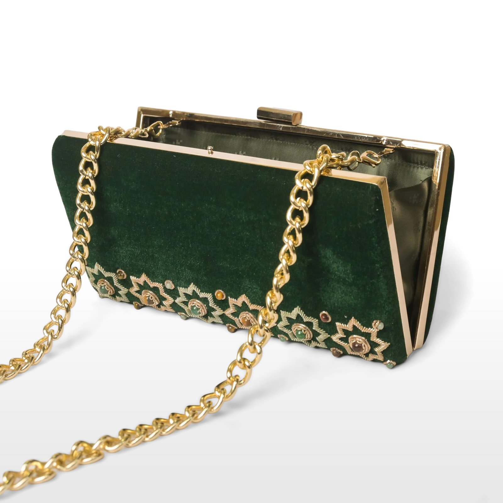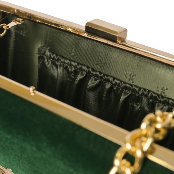The lush green velvet exterior is soft to the touch and exudes sophistication. Its exquisite hand embroidery showcases intricate patterns that are a testament to the skilled artisans behind this creation. The Tiger Eye gemstones add a touch of mystique with their golden-brown hues, while the Onyx gemstones provide a contrasting depth in black, creating a harmonious visual balance.