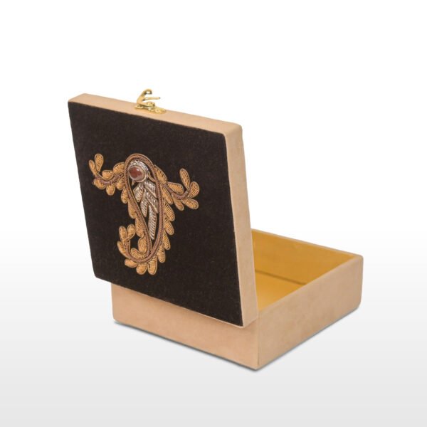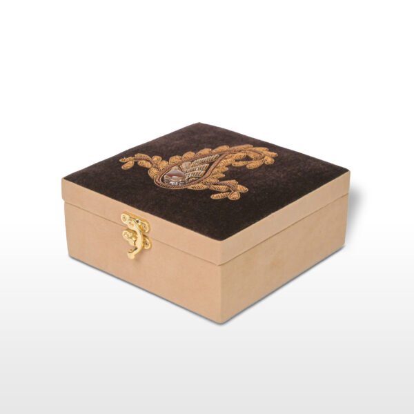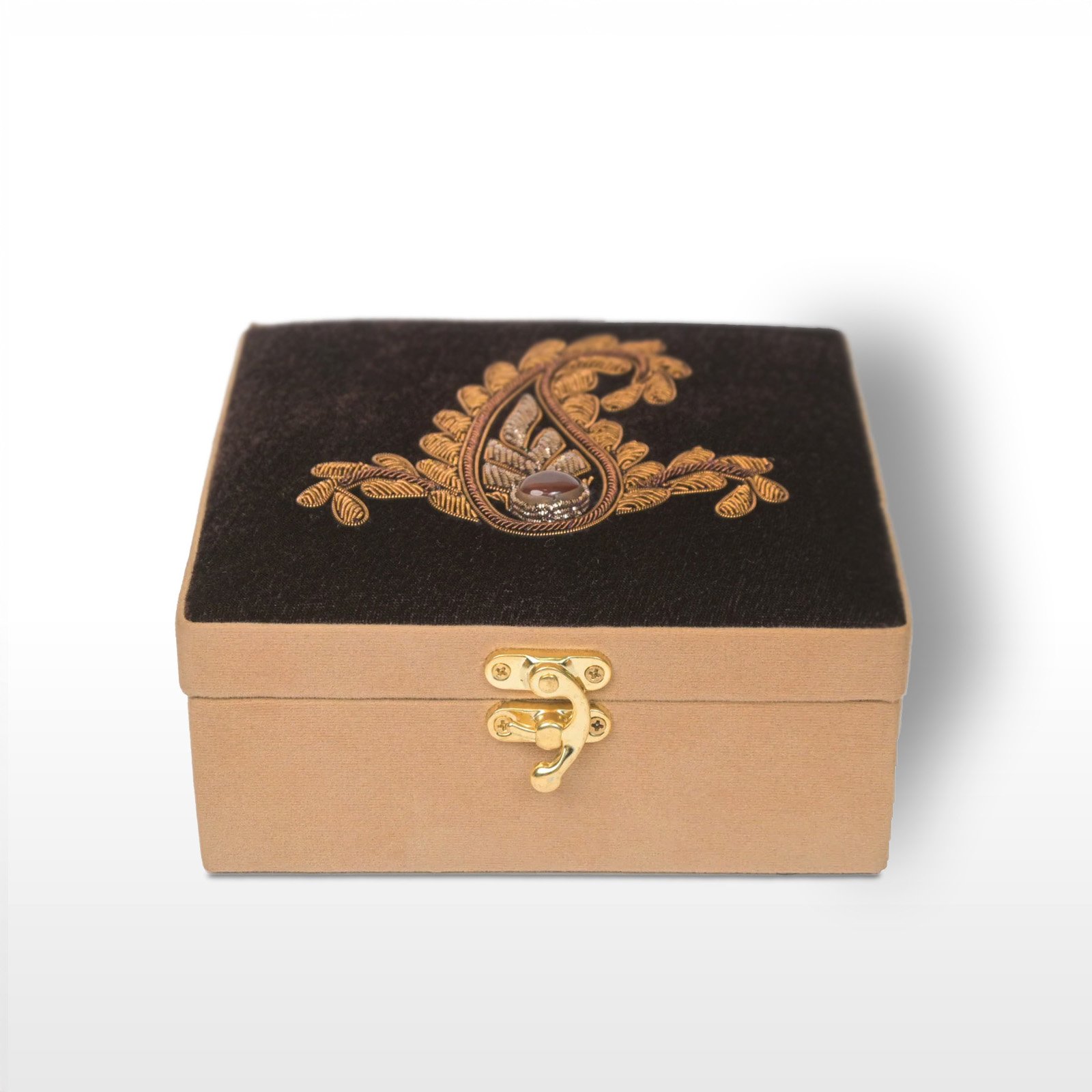 Elevate your gifting experience with our “Golden Elegance” Handmade Velvet Christmas Evening Gift Box. This exquisite creation combines the timeless charm of beige and brown velvet with the opulence of zardosi embroidery. Each intricate thread has been meticulously handcrafted to create a stunning zardosi design that adds a touch of regal sophistication to this box.