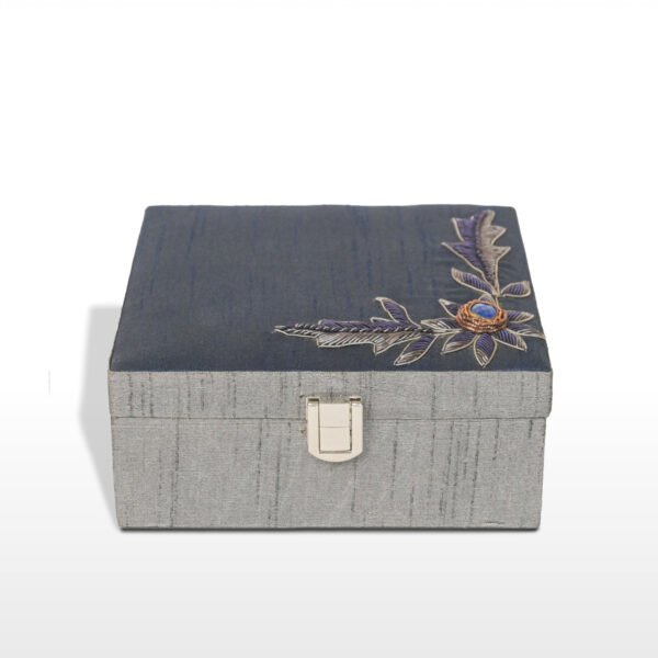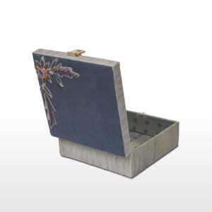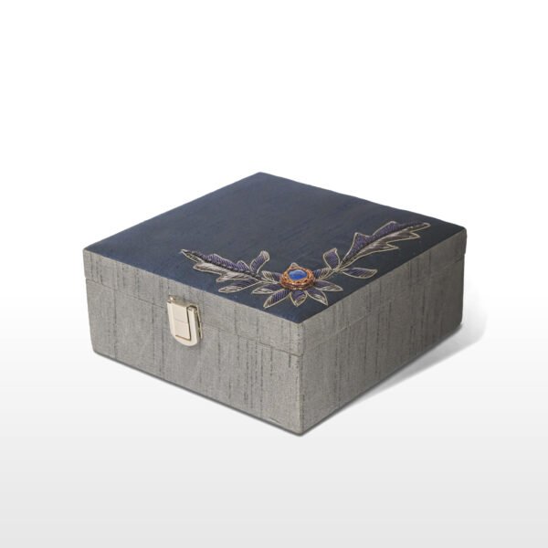 Elevate your gifting with our “Enchanted Winter Blooms” Handmade Christmas Evening Gift Box. Crafted in opulent blue and grey silk, this masterpiece is more than just a box; it’s a work of art. The exquisite flowering zardosi work, meticulously hand-embroidered, adds an air of elegance and charm.