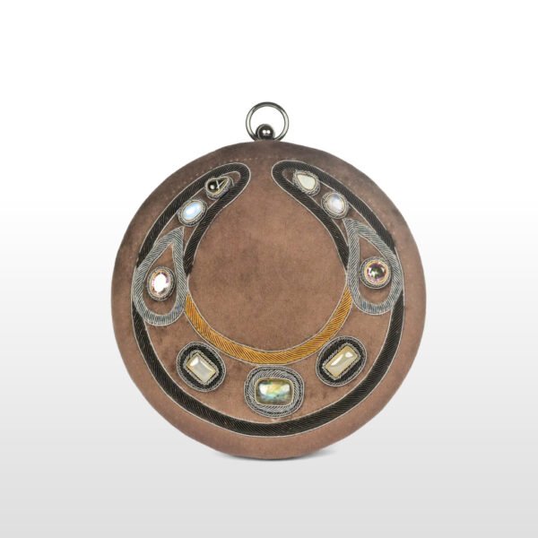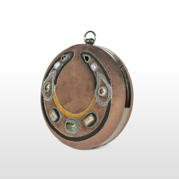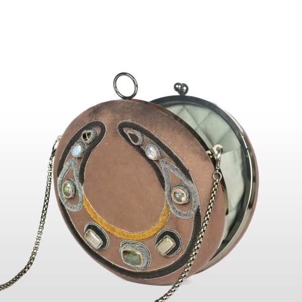 Whether you’re attending a gala, a wedding, or a romantic dinner, the “Mystical Moons” Brown Velvet Clutch with Labradorite, Moonstone, and Quartz zari work is the perfect accessory to complement your ensemble and make you feel like a celestial goddess. Embrace the magic and allure of these celestial gemstones and make a captivating statement wherever you go.