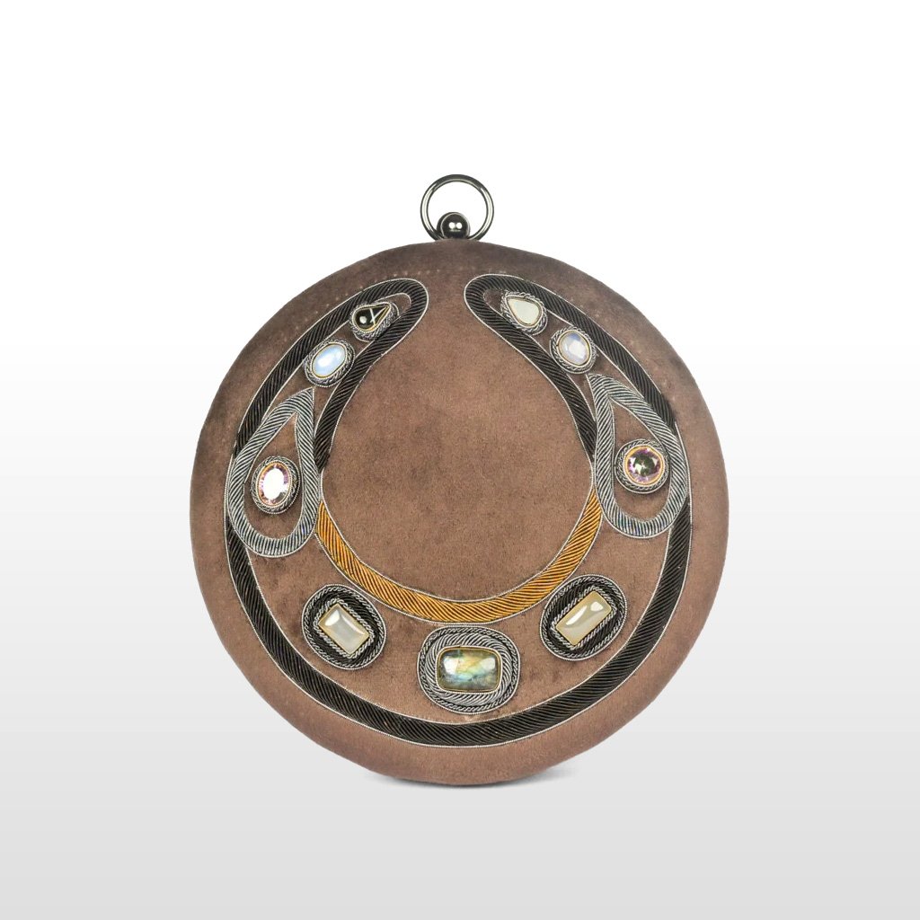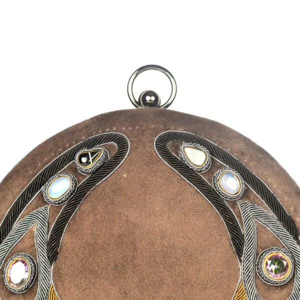Crafted from luxurious brown velvet, this clutch exudes a sense of sophistication and indulgence, making it the perfect companion for special occasions and evening soirées. The soft texture of the velvet adds a touch of luxury to your ensemble, while the rich brown hue complements the celestial gemstones beautifully.