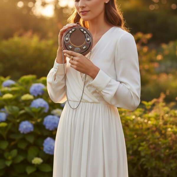 The round shape of the clutch adds a unique and charming touch, while the convenient top handle allows for easy and graceful carrying. The spacious interior is thoughtfully designed to hold your essentials, ensuring you can carry your must-haves in style.